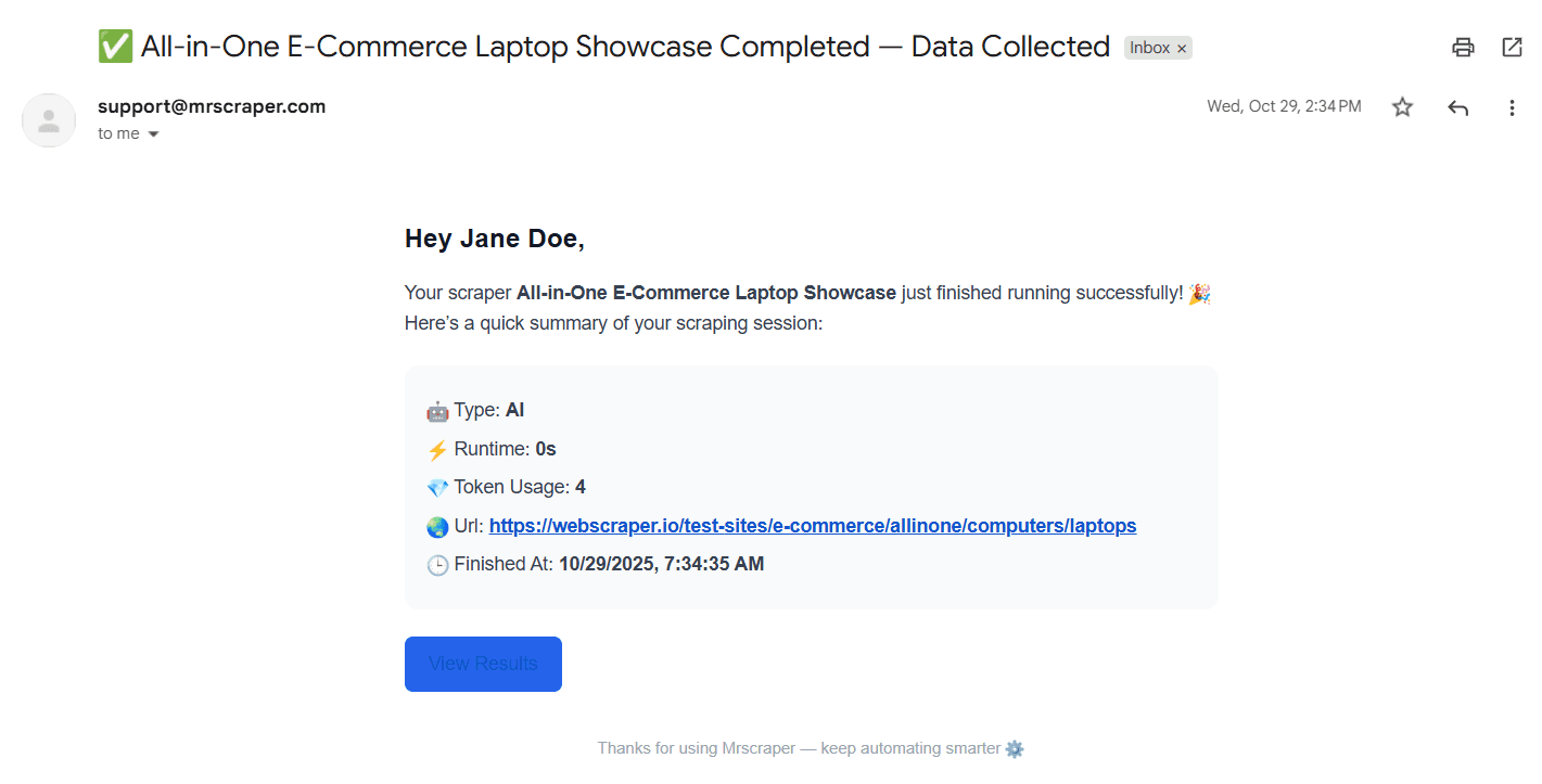 Once the scraper finished, you will receive an email notification. Depending on the email type you selected, the email will contain either the result in the email body or as an attachment. Here's an example of what the email might look like: