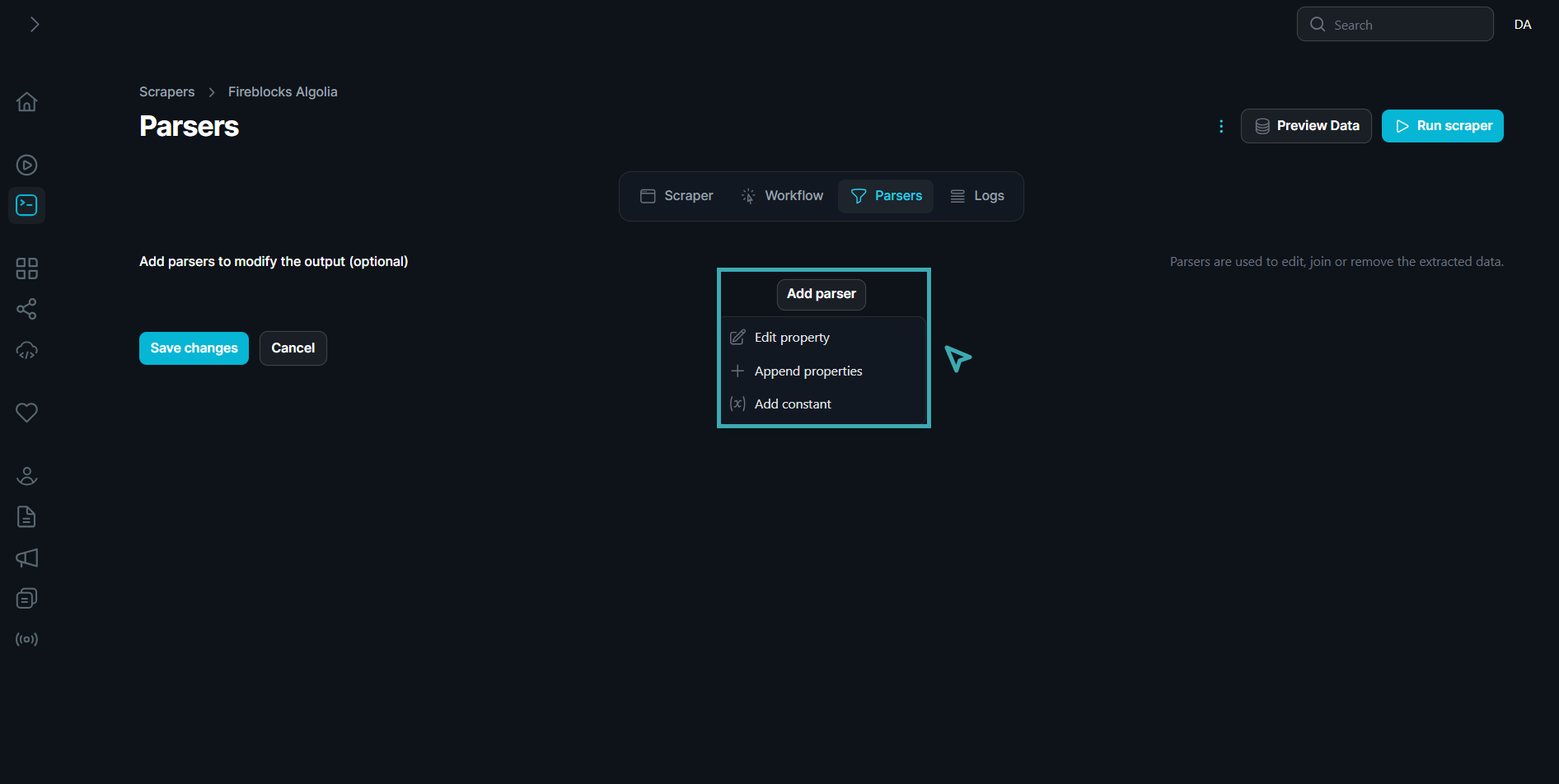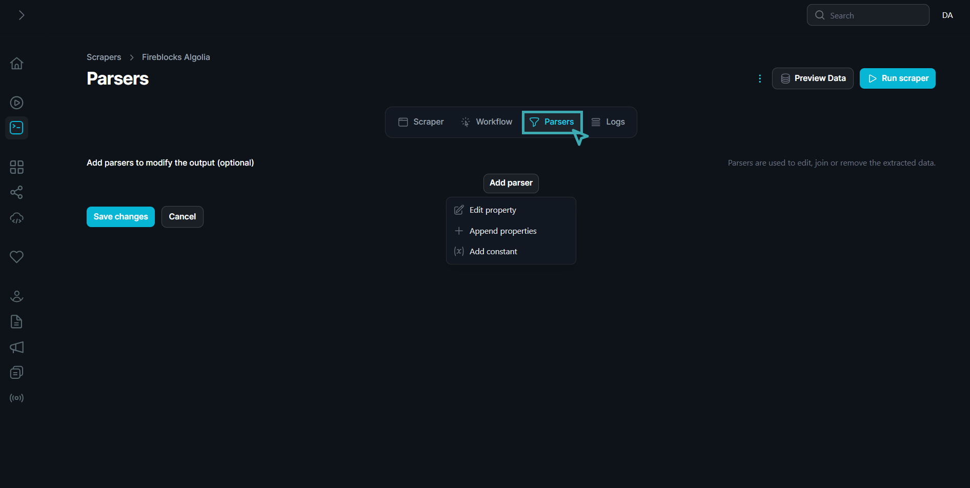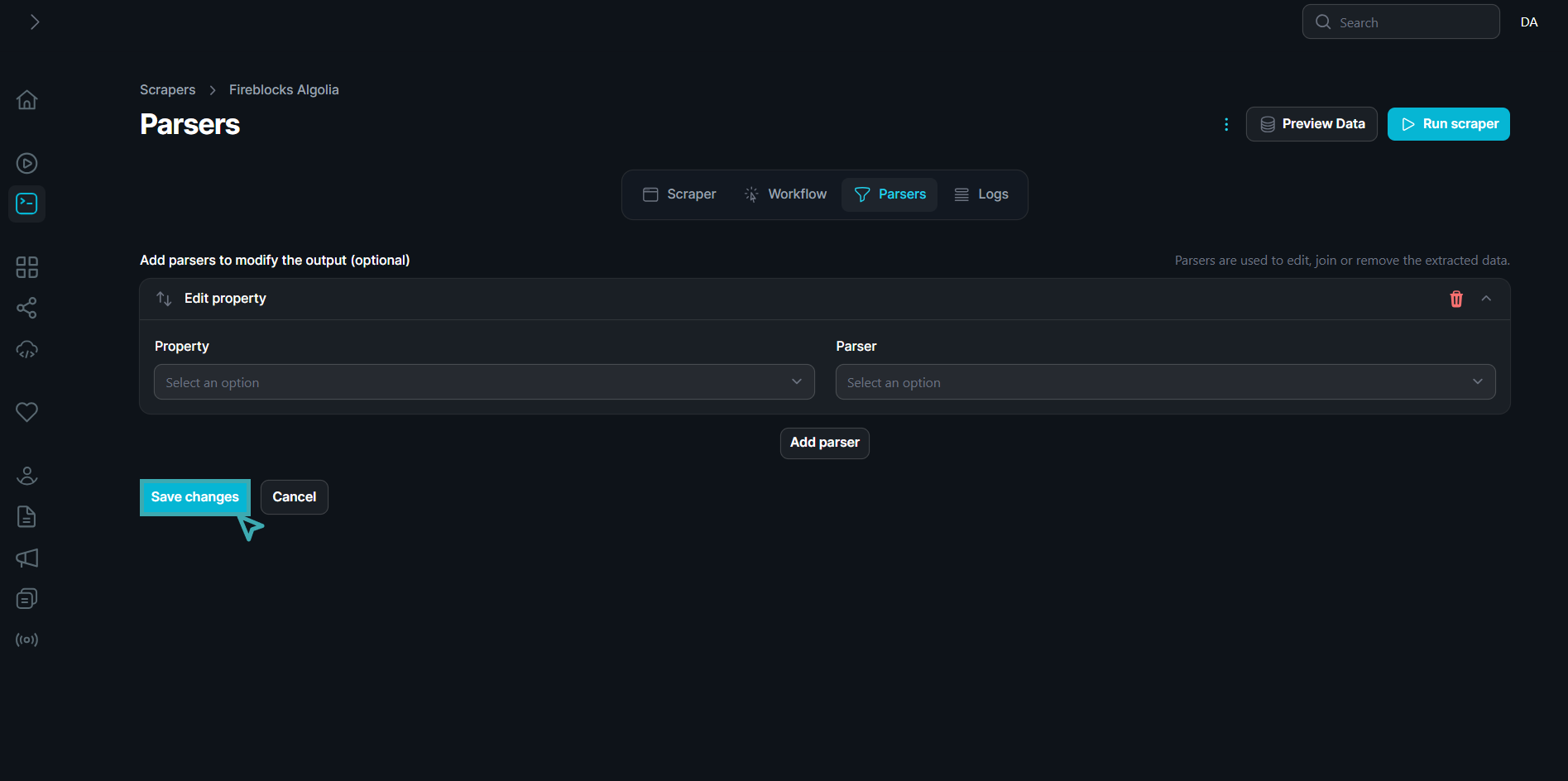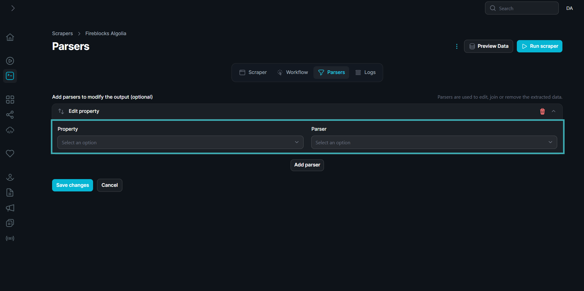 The Parsers feature in MrScraper allows users to modify the extracted data from a web scraper by performing a series of transformations or adjustments. The Parsers page is designed for flexibility, providing users with the following ability:- Edit Property