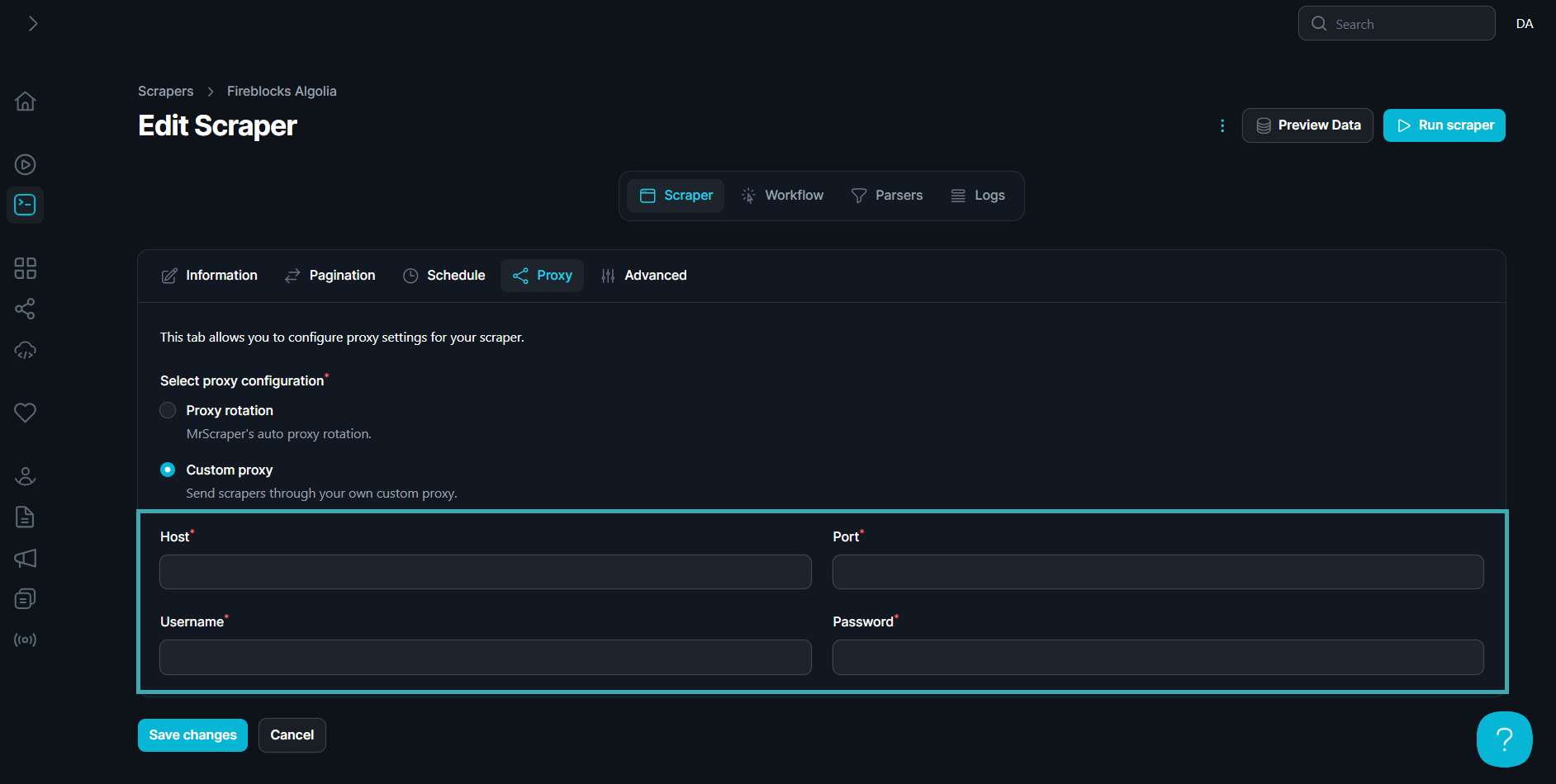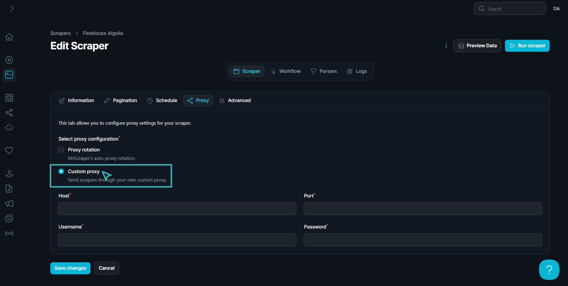 | Port | The port number used to connect to the custom proxy. The port ensures the correct communication channel between your scraper and the proxy server. |